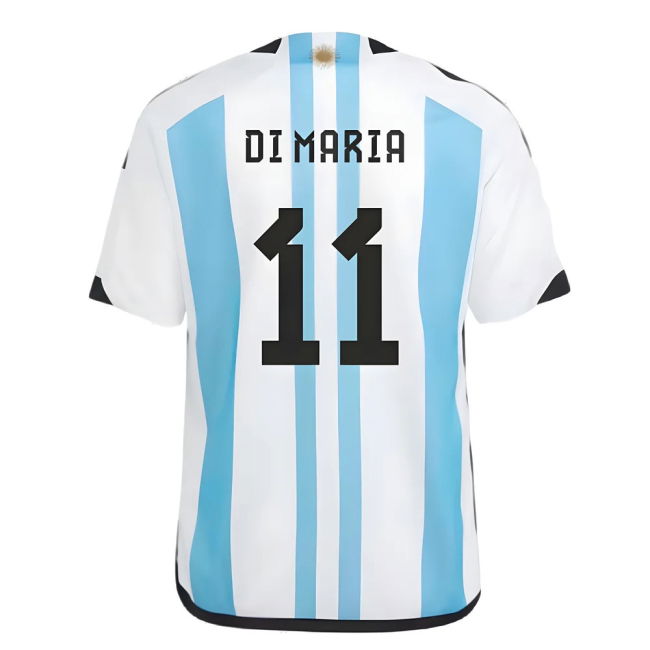Official Angel DI MARIA football shirt. This is the NEW Argentina 2022 World Cup Winners Home Shirt - Kids which is manufactured by Adidas and is available in all Childrens sizes.